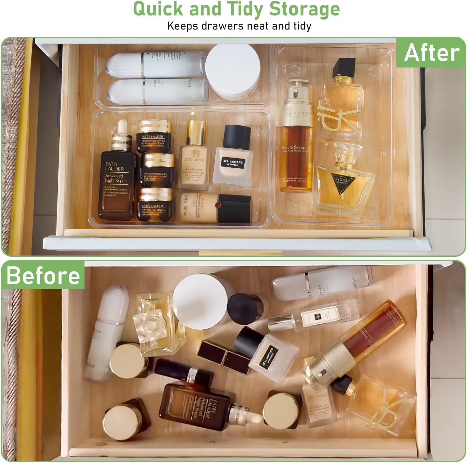 Streamline every space in your home with these versatile drawer organizer trays. Whether it's your vanity, bathroom, kitchen, office, craft room, or closet, these bins fit perfectly to bring order to any drawer or shelf.